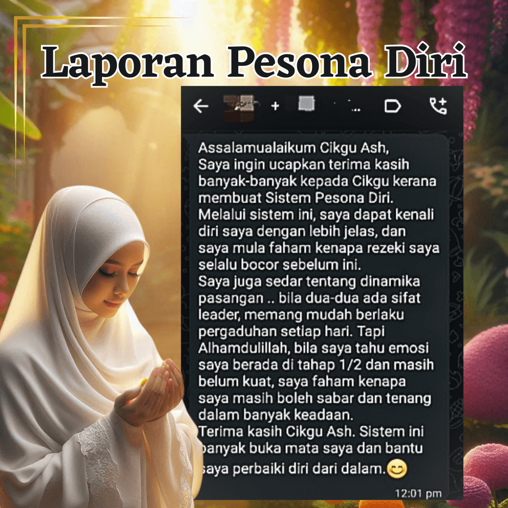 Kelas online intensif 12 jam (3 sesi) bersama Cikgu Ash: – Bongkar kepoweran hati sebagai magnet rezeki. – Kuasai teknik tarik rezeki dengan amalan & getaran emosi. – Guna hati untuk lembutkan customer & mudahkan urusan. – Pengisian ibu duit untuk menarik rezeki mudah.